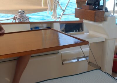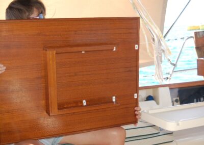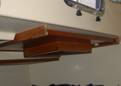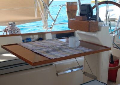 The table was made from teak veneer plywood with solid teak fiddles. The standard Island Packet cockpit table is used as the support base and the new teak table slides over it. The table is more stable and can be stowed away in the aft cabin overhead when not in use.